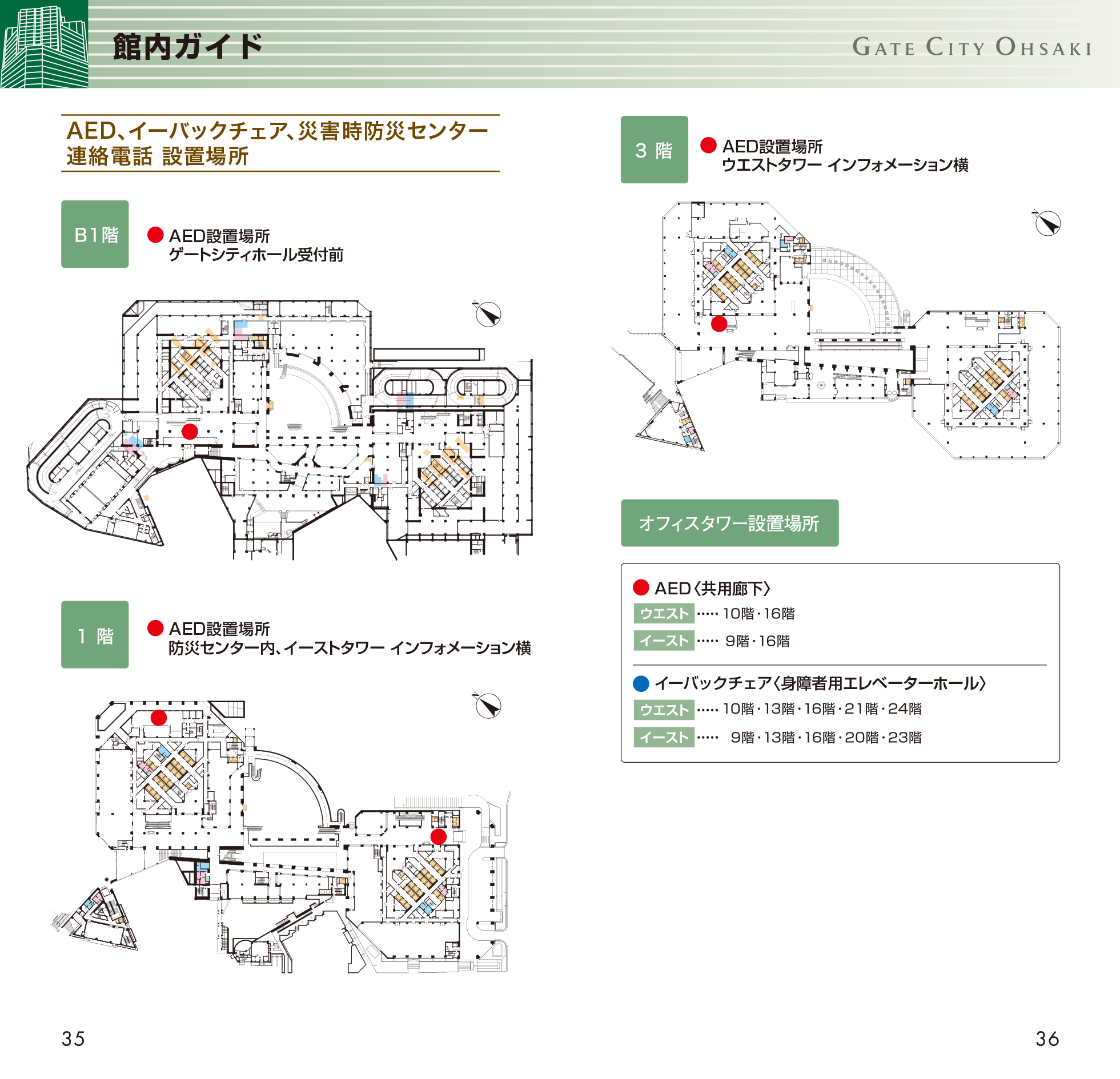 ウエストタワー16F、10F、3F、イーストタワー16F、9F、1Fのインフォメーションカウンター横と防災センターおよびゲートシティホール受付にございます。
