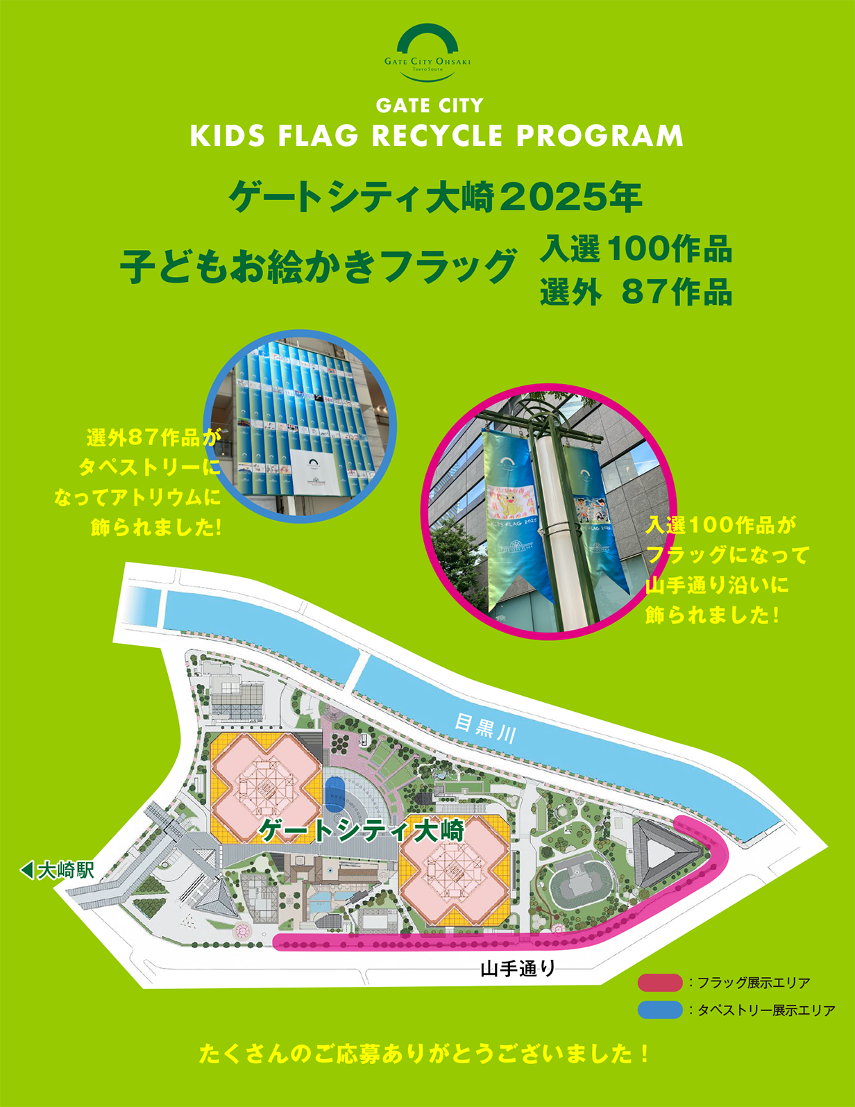 みなさんに描いてもらった絵は審査のうえ、100作品をフラッグにして山手通りに飾らせていただきます。